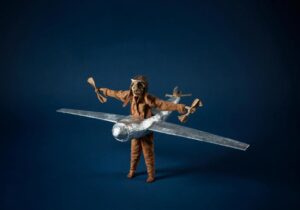 Steel, acrylic resin, board, dyed cotton, wine collars, cast and natural turkey, bird, wallaby bones, letter seedpods, silk, citrine and pearls, natural fibre
