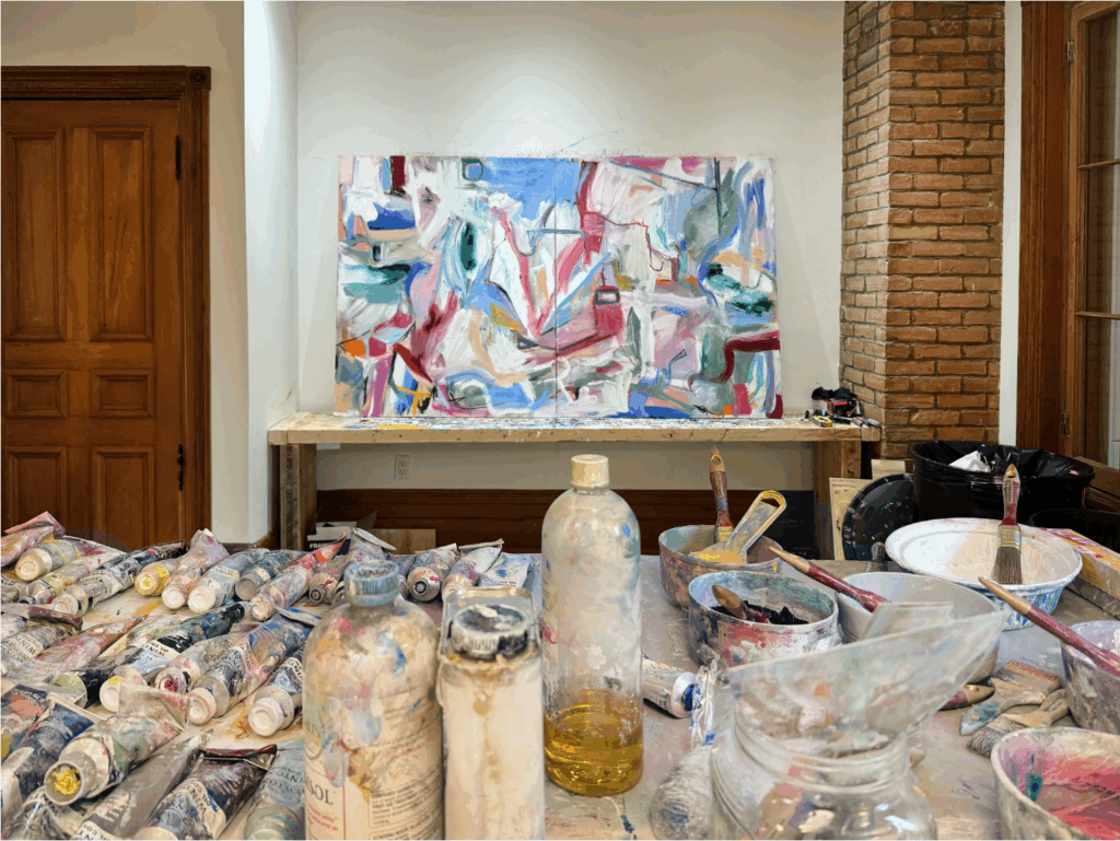 I am interested in how chaos and control can coexist on the same surface, how the cohesion of an abstract painting can feel so tenuous, like it is hanging by a thread. These works often teeter on the brink of collapse, and yet, with enough pressure or patience, they can, if I am lucky, suddenly lock into place. That problem-solving aspect, the push and pull between chaos and resolution, is deeply fascinating to me.