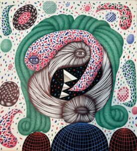 pencil, ink, coloured pencil and goauche on reverse of found LP cover