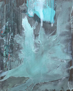 Abstraction in vinyl acrylic oxidised copper reaction acrylic attachments dewaxed shellac over vinyl on acrylic primed linen