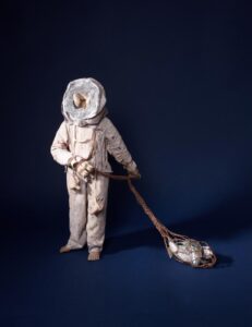 Steel armature, cast acrylic resin, dyed cotton, acrylic fibre, sheep bones, human teeth