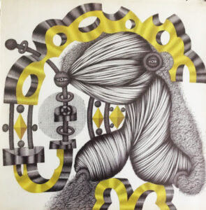 pencil, ink, coloured pencil and goauche on reverse of found LP cover