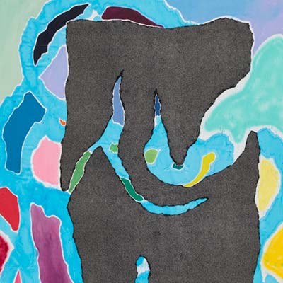 from tarpaper, layered starkly above a vibrant collage of fabric,
