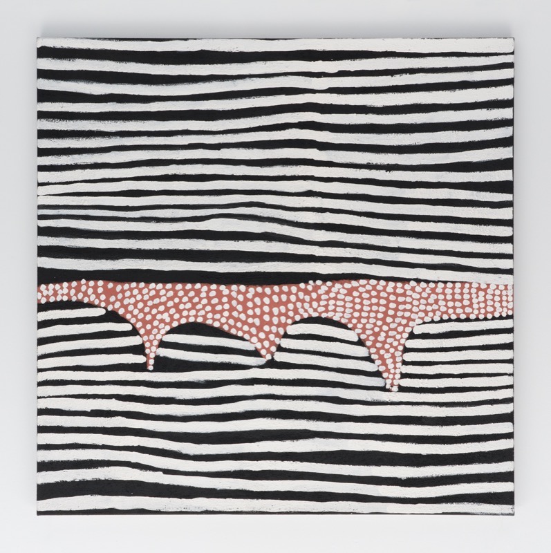 She began painting when Freddie Timms set up Jirrawun Arts at Crocodile Hole. Her work depicting Dreaming places and bush tucker from the Crocodile Hole area as well as the country around the middle reaches of the Ord and Turner rivers where she was born, achieved almost immediate success. She was represented in the Telstra Art award exhibition in 1999 with a stunning picture Boornbem Goorlem, Hot Water Spring II done in black and a pinkish red colour made by mixing red and white ochre. The spring is in a gorge with the open sky shown as a plain expanse of paint above the water and rock faces. Other works include Bush Honey - ‘Sugarbag’ Dreaming at Dry Swamp in which the dark cells of the hives float on a plain ground, and Loomoogoo Blue Tongue Lizard Dreaming in which a prominent landscape feature is seen from the side. Boorljoonngali's work has been acquired by a number of collectors and galleries including a special focus purchase of five paintings by the Western Australian Art Gallery in 2000. Her painting 'The Escape' done as part of a series of paintings relating to massacre stories by Jirrawun artists intended to be shown together as "Blood on the Spinifex" was exhibited at the Seventeenth National Aboriginal and Torres Strait Islander Art Award Exhibition in 2000 and was highly commended. It was purchased as part of the MAGNT Telstra collection. This image was used as the poster and catalogue cover for the exhibition at the Ian Potter Museum of Art at the University of Melbourne between December 2002 and March 2003. An eight panel series on the same subject was shown at Raft Artspace in Darwin in April 2002. This was purchased by the Western Australian Art Gallery in 2003. Boorljoonngali was also a singer and dancer with the Neminuwarlin Performance Group in its production of Fire, Fire Burning Bright which premiered at the Perth International Arts Festival in February 2002 and opened the Melbourne International Festival of the Arts the State Theatre of Victoria in October 2002. She sang the haunting Warnalirri with Peggy Patrick on the second half of the group’s CD released in 2002 during PIAF. In 2017, Boorljoonngali's work created during the Jirrawun era was featured in a special exhibition at the Art Gallery of South Australia during the TARNANTHI festival; the same eight panel Gemerre series was later featured in RAFT Artspace's special duo show, featuring her works and those of Peggy Patrick in Alice Springs (in June 2018). Boorljoonngali later created a beautiful painting reminiscing her sisters who were stolen from their birth country and placed in Wyndham, in a painting titled "My Stolen Sisters from Gija Country," which was a finalist in the Art Gallery of NSW's 2018 Wynne Prize. The great artist attended her last Warmun artist weekly Tuesday meeting on Tuesday 30th October 2018, where she enjoyed the special birthday cake marking the 20th Anniversary of Warmun Art Centre with some fellow artists and friends.